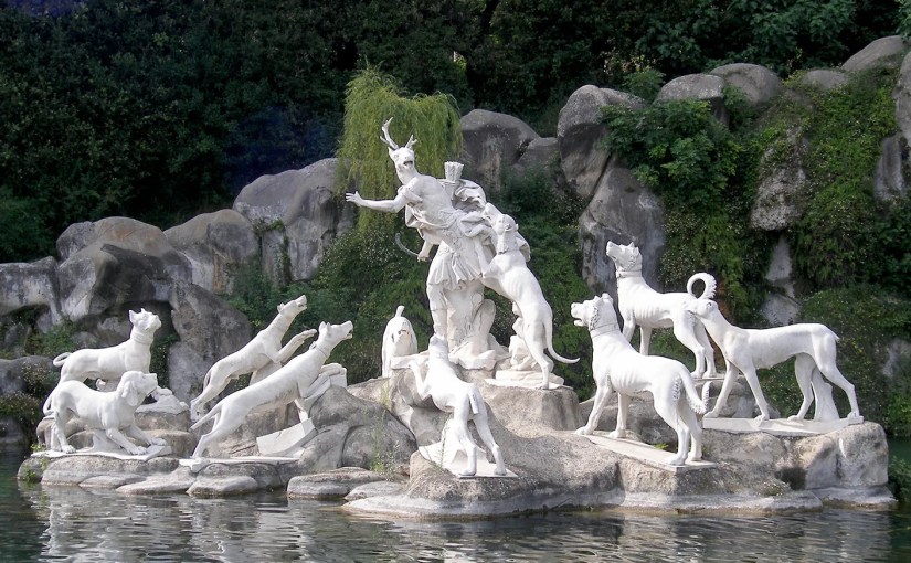 The paradisal now of the goddess meets historical (tragic) human time. The word spoken twice aloud, hither, hither, urges haste, propels time body matter forward, while those repeated silently, gold, gold … blaze, blaze, fix attention, intensify the sensory moment, hush and slow the mind. Meanwhile, on a larger scale, the phrase that bookends the scene, “The dogs leap on Actaeon,” fixes the unfolding action in place, so Actaeon enters mythic time.