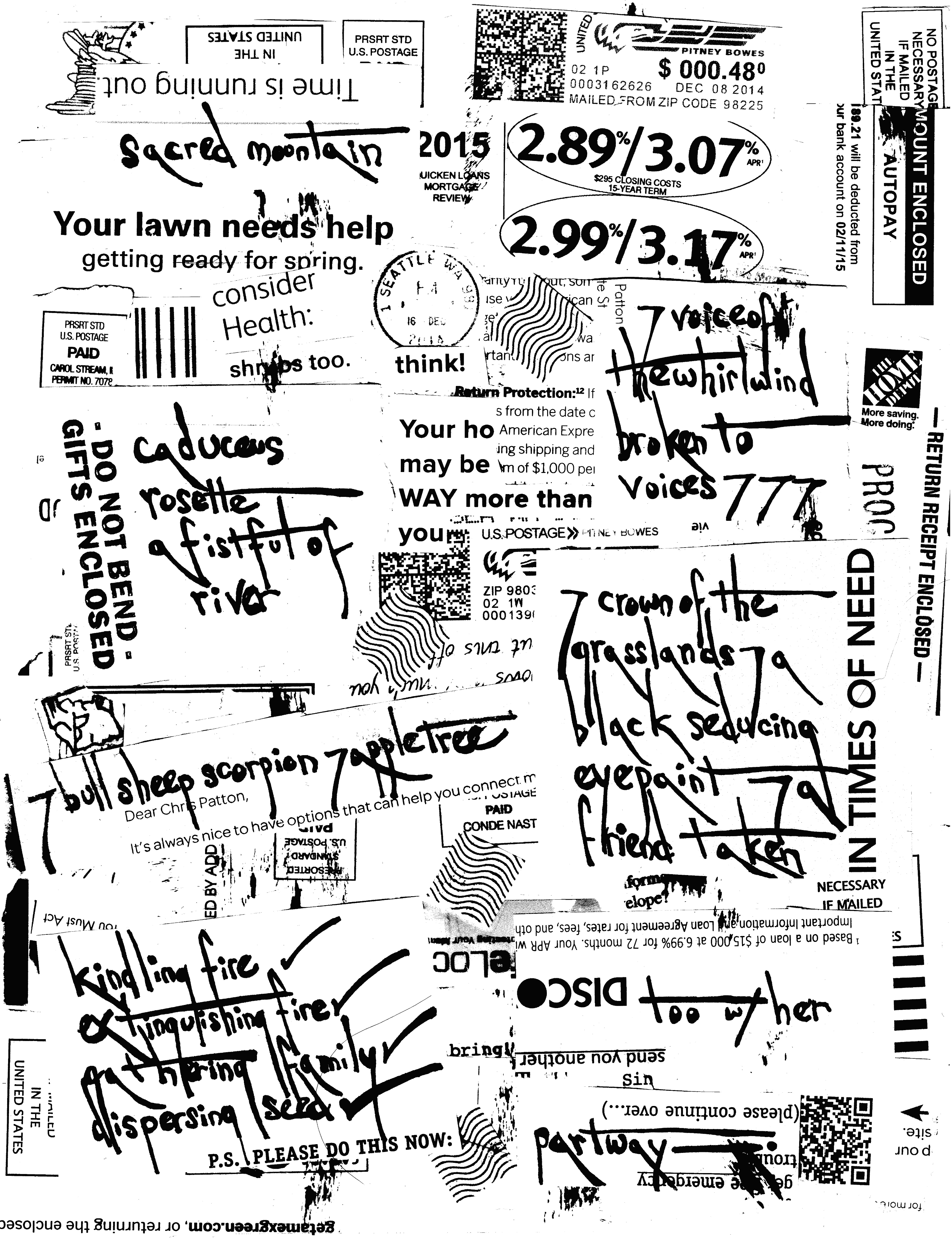 Why junk mail. A fertility myth tells how grain gets from the ground to your table to your belly. At some point it invokes sex (and not metaphorically, what those grasses are doing in the wind is fucking) and at some point it acknowledges the marketplace — grain’s not going to get from the ground to your gut without being bought and sold as a commodity, not anymore, not by the time such a myth as this comes about.