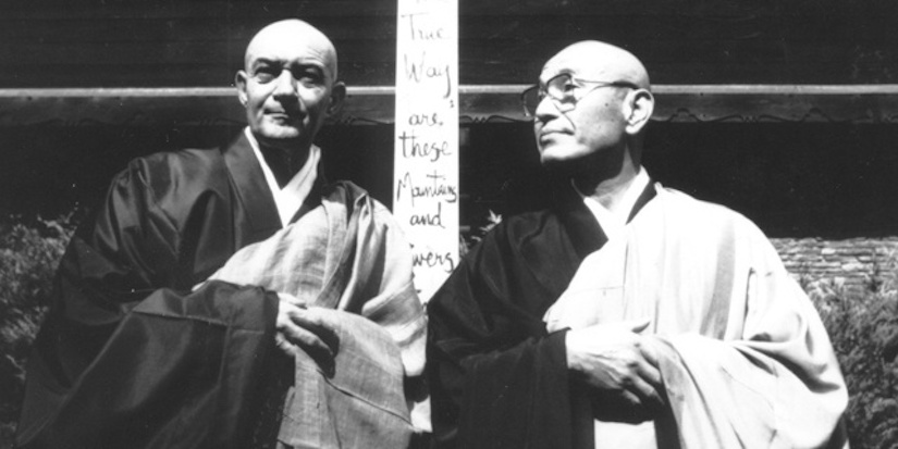 you don’t think, piss bubbles breaking into smaller bubbles in the toilet basin, or, sadness I feel at not having felt what someone wished I felt for them, which is a clean sadness, not the bitter sadness I would have felt if I’d dissembled. You don’t think, cat impatient in the tub for you to run the tap because for what ever effing reason that’s how she drinks water except as soon as you run it she jumps out of the tub. You don’t think, these two and a bunch of others all intersecting wildly and the whole of it and each portion of it. But – did everyone else know this already? – that’s what the lines mean. Form is form. No one is left out. The photo is my teacher and his teacher. Muge Daido Daisho. Taizan Maezumi Daisho.
