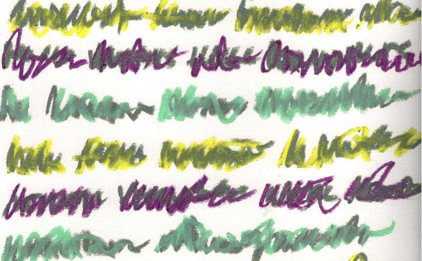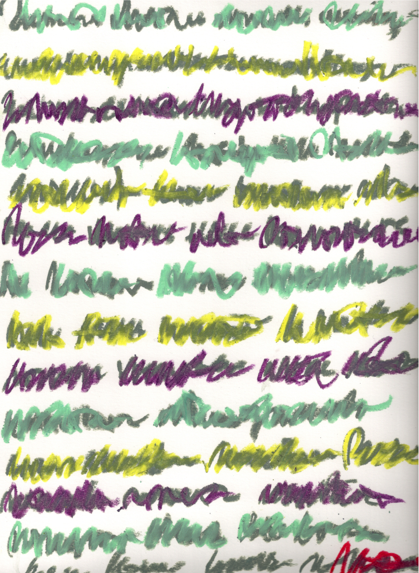 It’s barely more than scriggles. But that it gave me a word, scriggles, totally for free, means lots. It’s second-order creative; it creates creativity; it’s generative. Those earth and vegetal tones are life-in-potential. (Even what colourblind I thinks to be purple, the chlorophyll of the low-light set.) Just as asemic writing itself is meaning-in-potential.