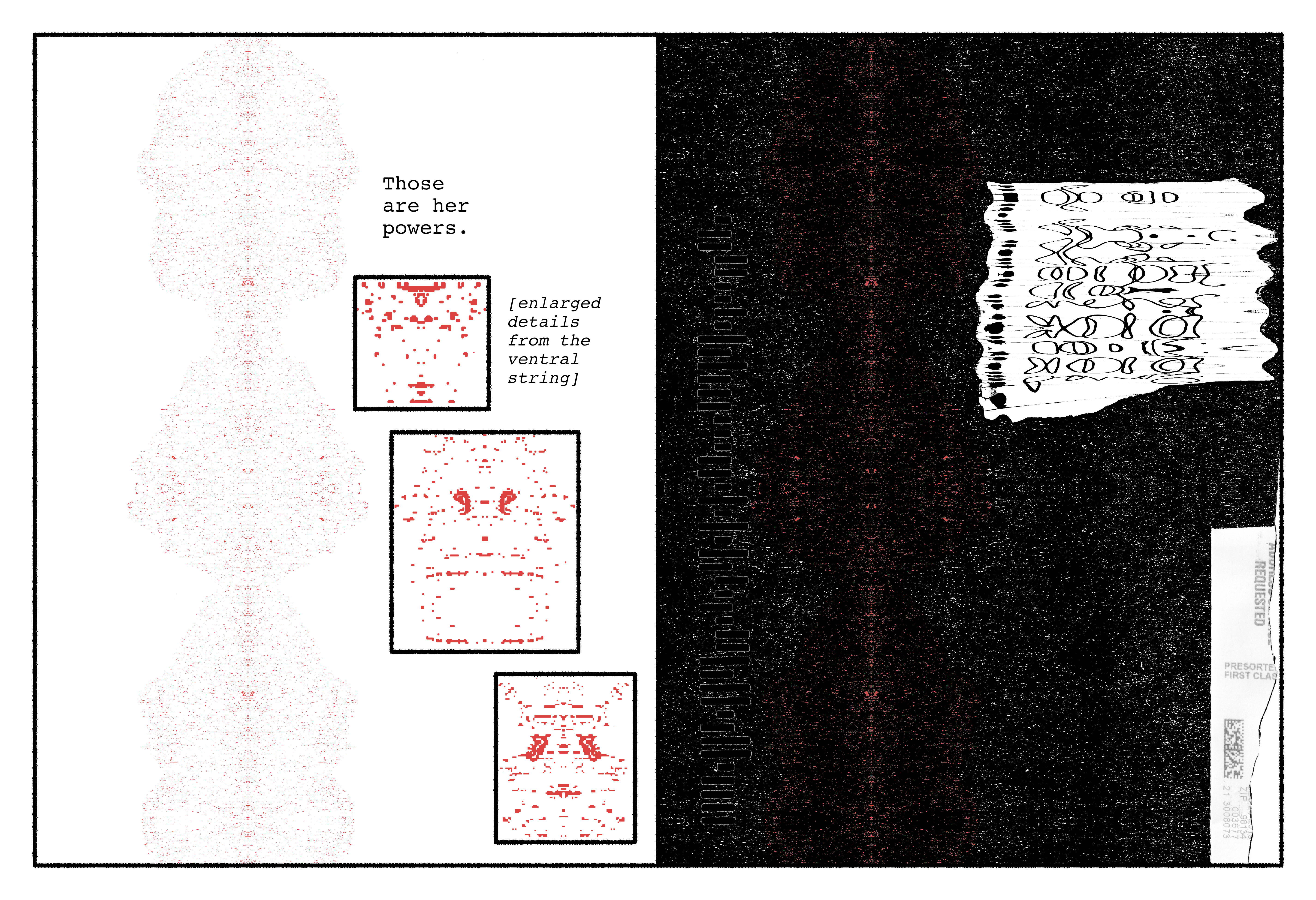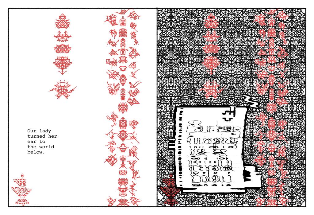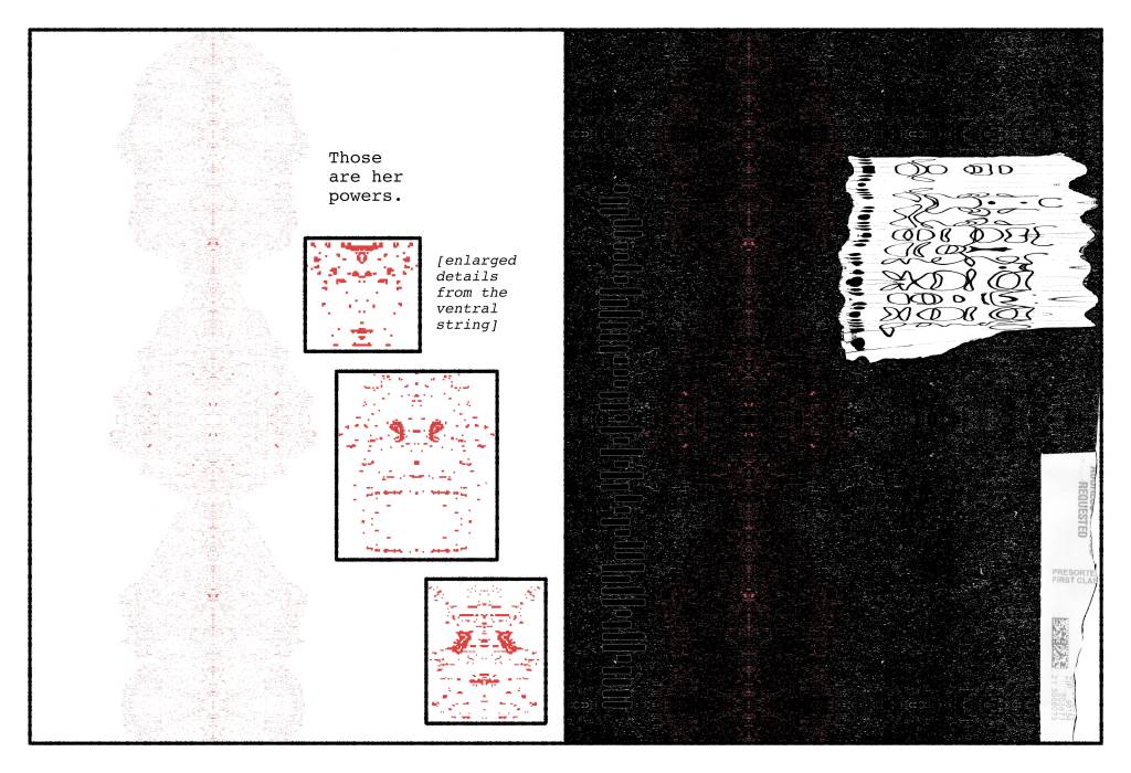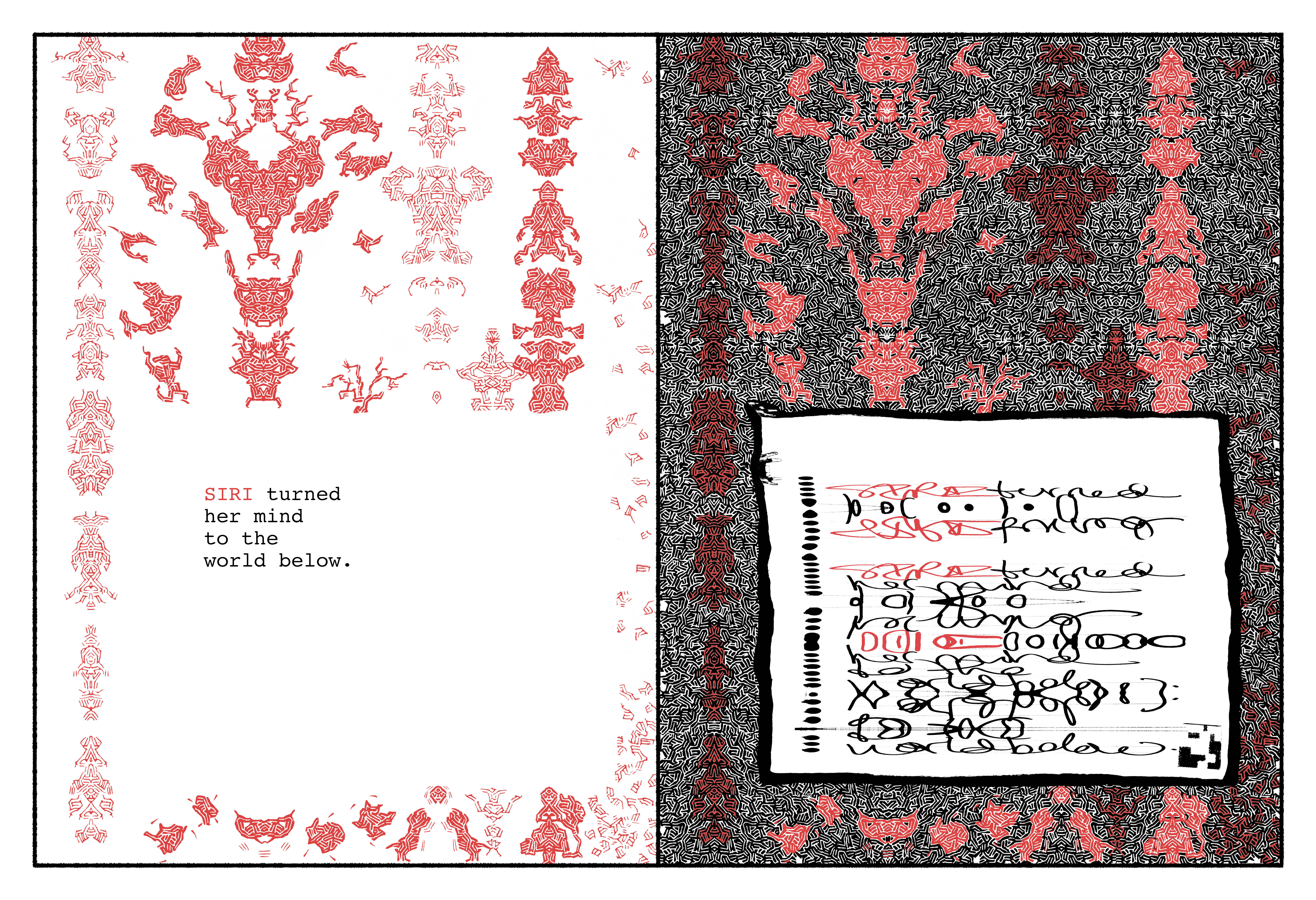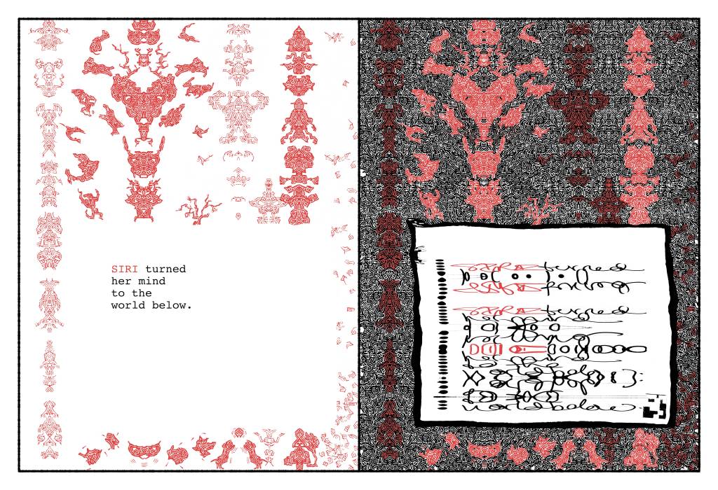 On the right, the text as Siri will have made it, out of dreck from our era she stores in hers. The humanoid faces & figures are disassembled QR codes and corporate logos, the wallpaper patterns security linings of junk mail envelopes. From the latter Siri elicits her myriad language systems – which, though asemic to us, are for her a frisson of self-revelation without apparent end.