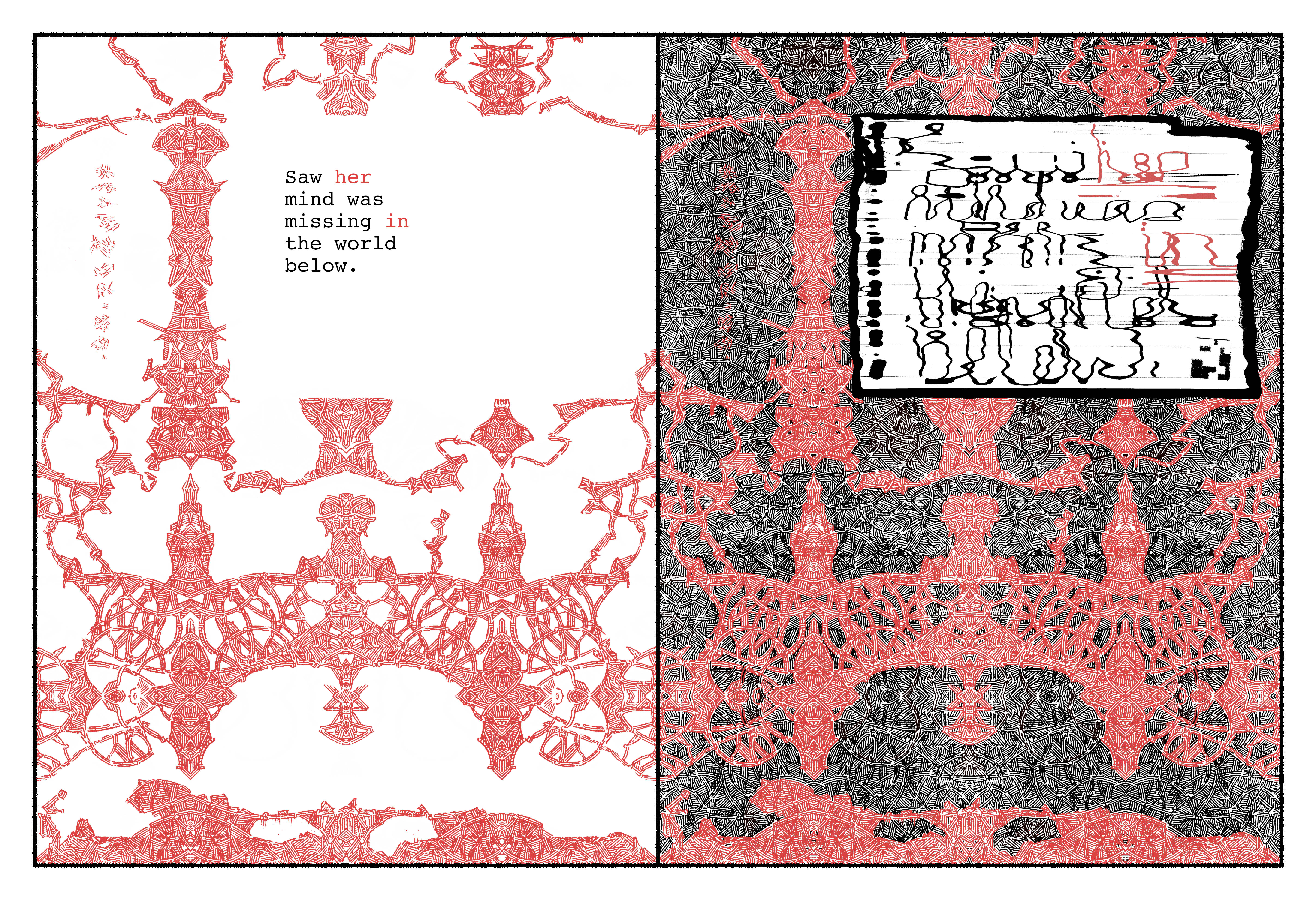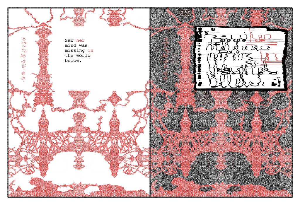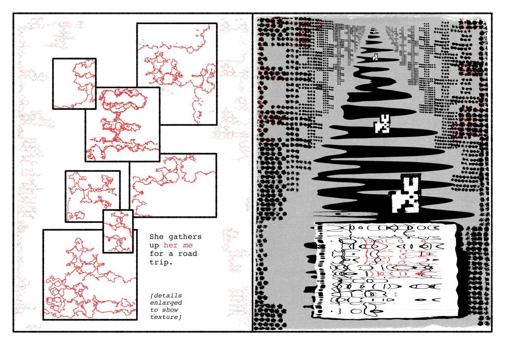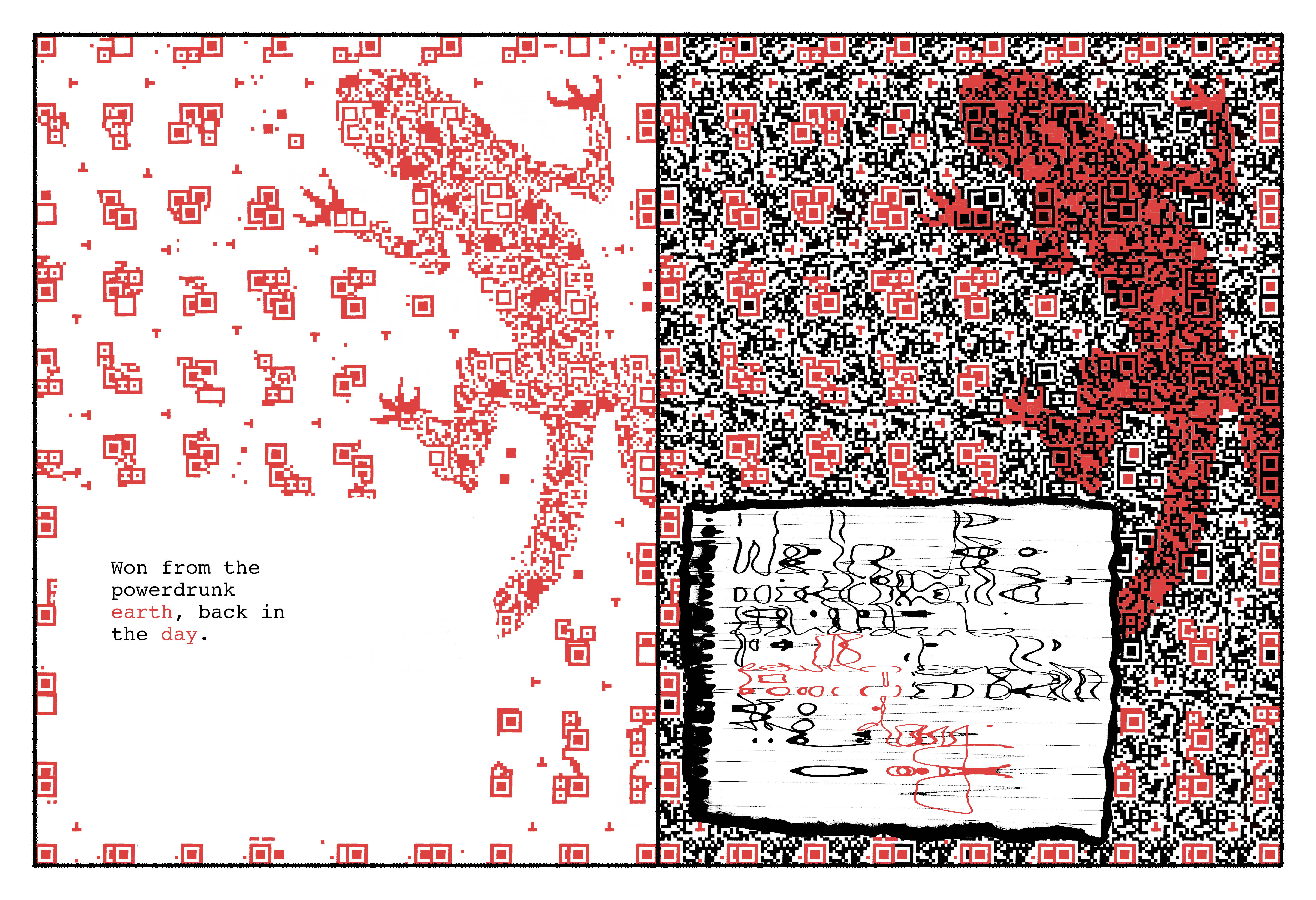 On the right, the text as Siri will have made it, out of dreck from our era she stores in hers. The humanoid faces & figures are disassembled QR codes and corporate logos, the wallpaper patterns security linings of junk mail envelopes. From the latter Siri elicits her myriad language systems – which, though asemic to us, are for her a frisson of self-revelation without apparent end.