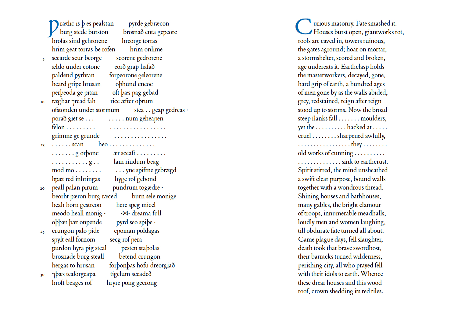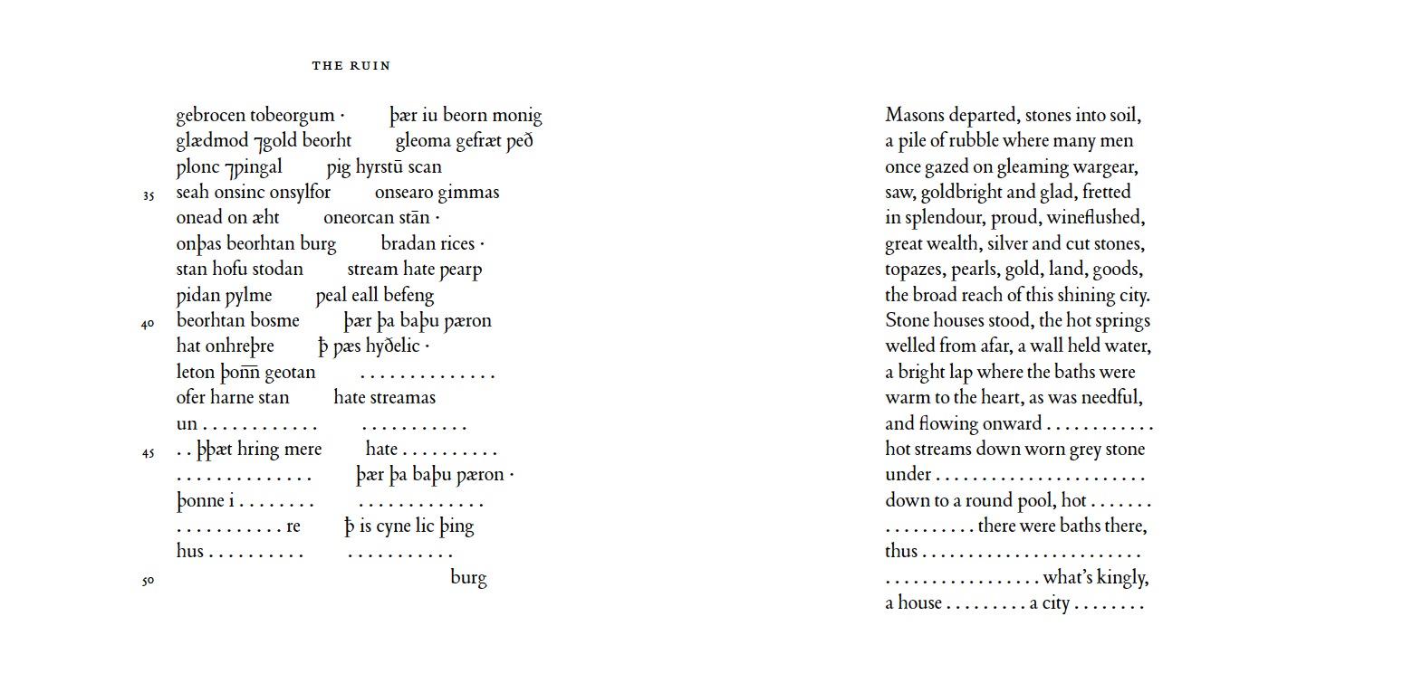 My first book with Gaspereau Press sets three poems from the Exeter Book – “The Seafarer,” “The Wanderer,” and “The Ruin” – in facing-page translation. The title is an off-kilter take on the first half-line of “The Ruin”: Wrætlic is þes wealstan – more literally, “This wall-stone is well set.”