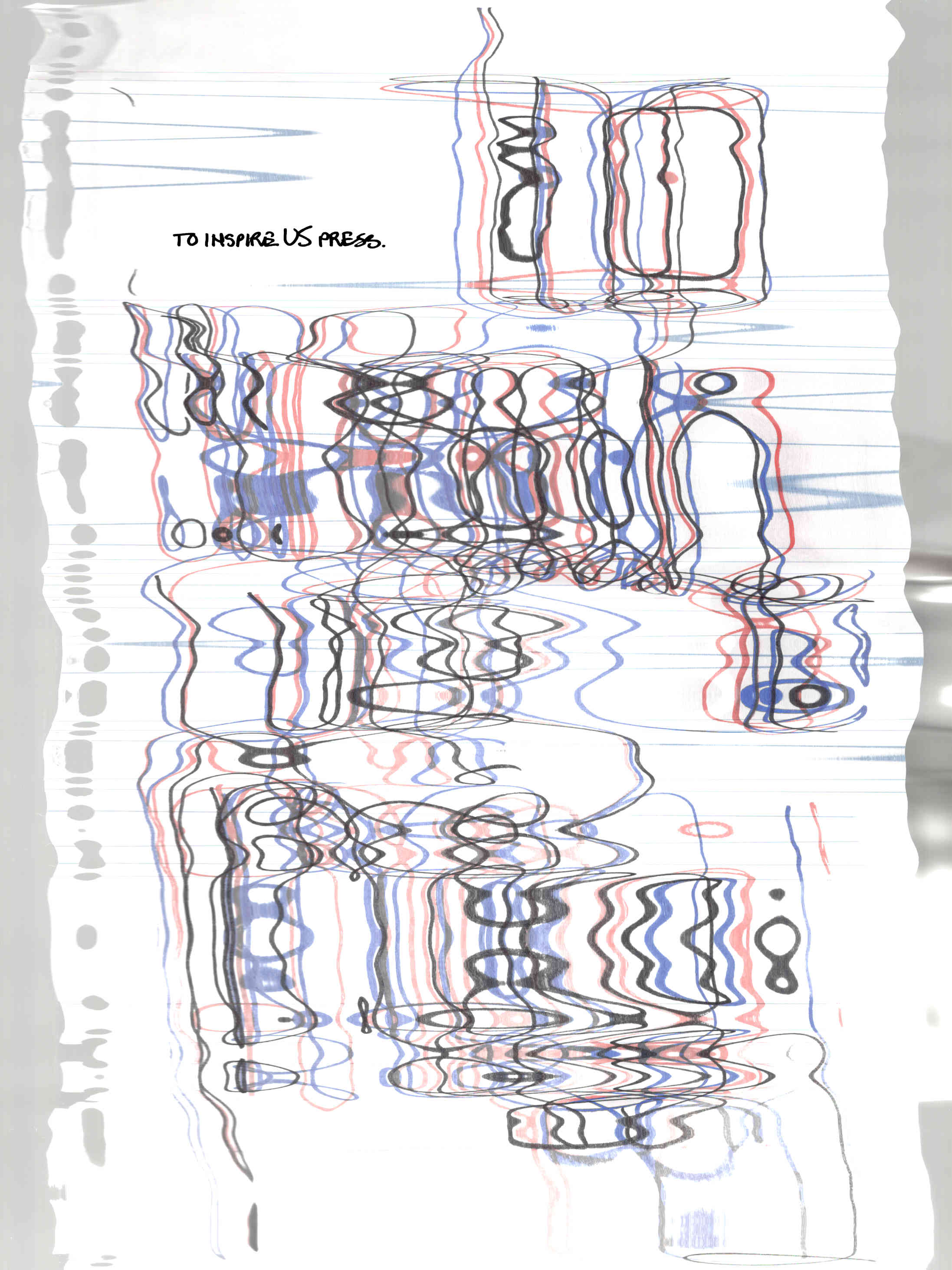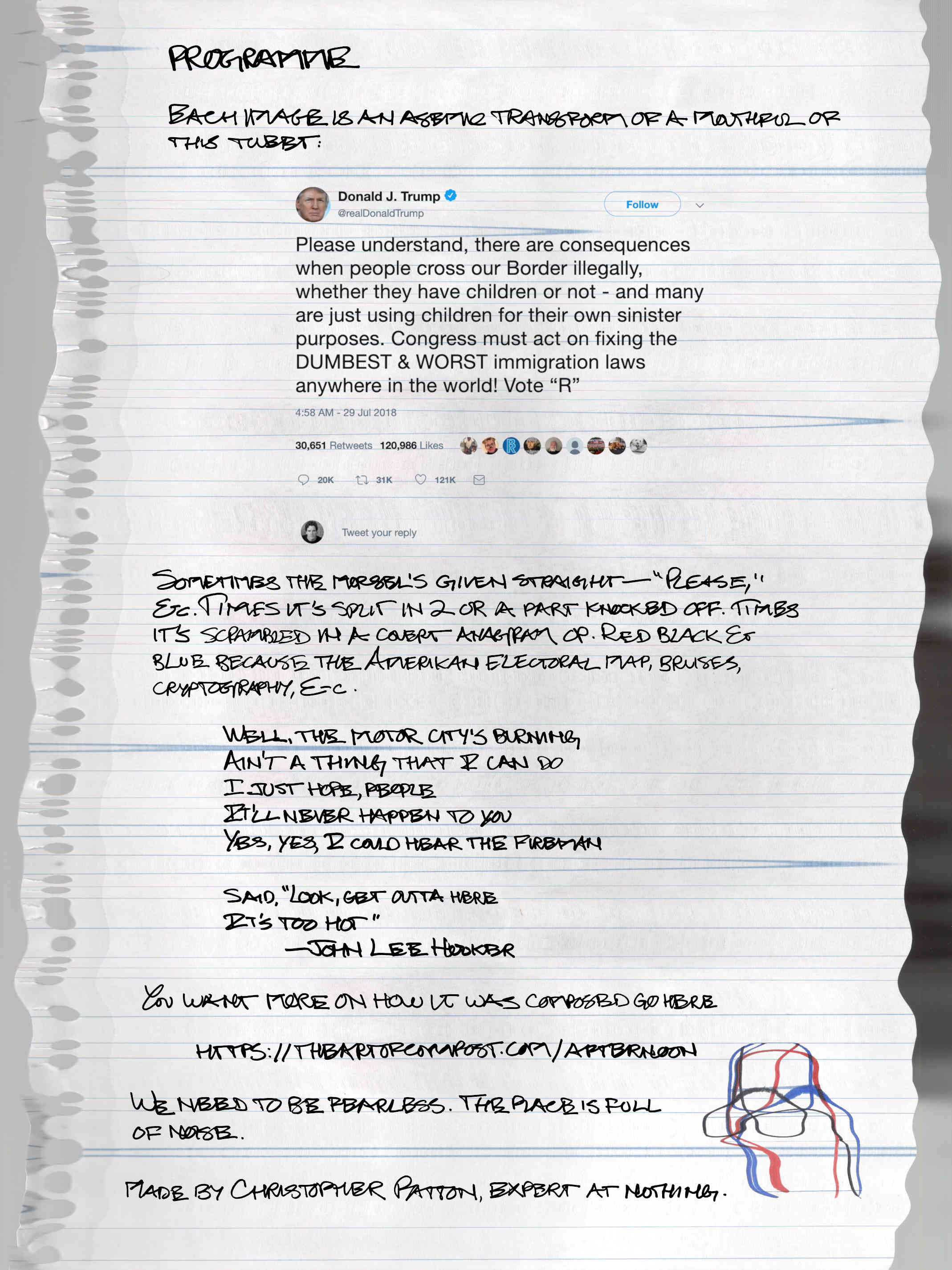 My text is a tweet in which Trump defends his obscene & criminal family separation policy. The page becomes a wide bright river of hungry ghosts, apostolic patriarchs, enraged fertility goddesses, spooky mind bugs & children stranded & bereft. The images, made by rocking handwritten journal pages on a scanner, rely on pareidolia, the tendency to see faces & forms in abstract patterns, to take shape.